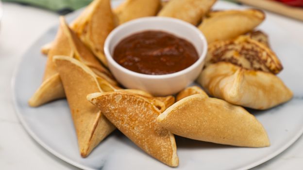 - Gotowe trójkąty przełóż na blachę wyłożoną papierem i piecz przez 15 minut w rozgrzanym do 180 stopni Celsjusza piekarniku. Serwuj z ulubionym sosem.