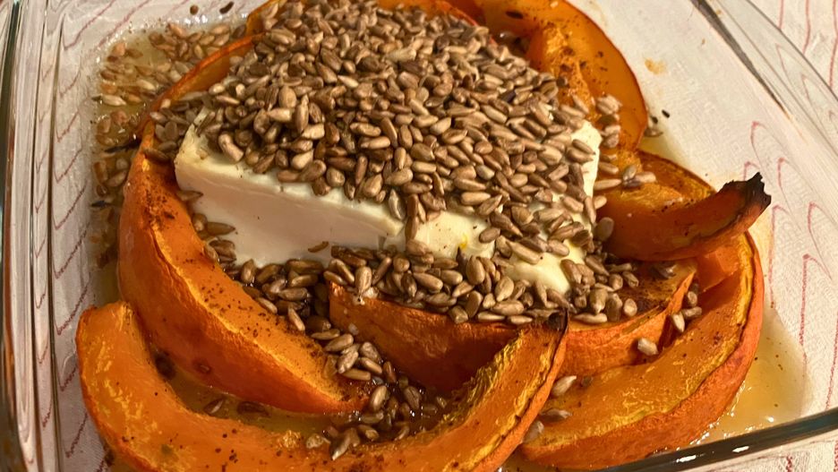 Po upieczeniu posypałam dynię i ser prażonymi nasionami słonecznika, które są moim ulubionym dodatkiem nie tylko do sałatek i wytrawnych przekąsek, ale także do owsianki. Jednak możliwości na chrupiące wykończenie jest o wiele więcej – możesz posypać dynię sezamem – w taki sposób Grecy podają swoją ulubioną przekąskę – lub pokruszonymi orzechami włoskimi.