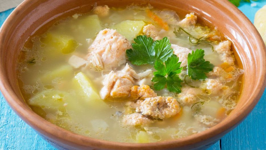 Równolegle gotujemy w osobnym naczyniu ziemniaki (ok. pół kilograma). Zupę zagęszczamy kwaśną śmietaną wymieszaną z mąką (uważając, by ryba się nie rozpadła). Zalewamy nią porcję ugotowanych ziemniaków wyłożonych na talerze, posypujemy posiekaną natką pietruszki.