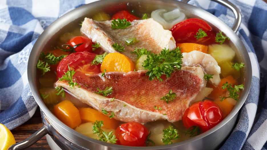 - Wyjmij kawałki ryby i warzyw, a wywar przecedź.
