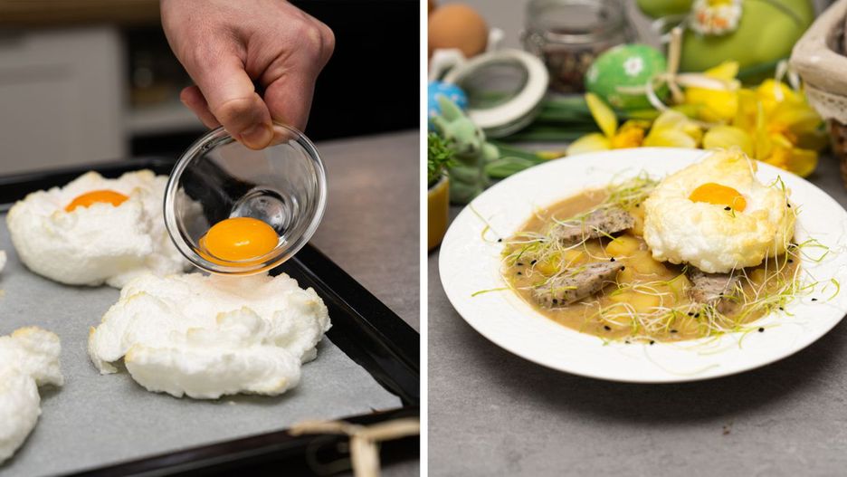 Przygotuj jajeczne chmurki. Oddziel żółtka od białek tak, aby zachować je w zwartej formie, najlepiej wbić każde żółtko do osobnej miseczki. Białka ubij na sztywną pianę ze szczyptą soli i wyłóż chmurki na blaszce z papierem do pieczenia. Zrób w białku wgłębienie przy pomocy łyżki. Wstaw do piekarnika rozgrzanego do 180 stopni Celsjusza i piecz 4-5 minut. Po tym czasie we wgłębienia dodaj żółtka i piecz przez kolejne 3-4 minuty.